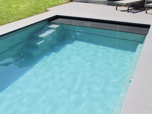 Das Becken hat kubistisch inspirierte Stufen, welche sich direkt vor dem Platz für das Compass Pools Rollo Cover befinden.